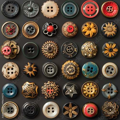 A collection of vintage buttons displayed on a dark background showcasing various styles, shapes, and vibrant colors perfect for crafting projects