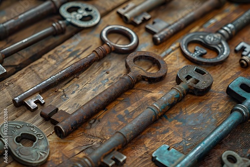 A Collection of Vintage Keys on a Rustic Wooden Surface
