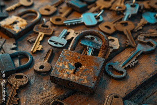 A collection of vintage keys resting on a rustic wooden table. Perfect for illustrating concepts of nostalgia, mystery, or treasure hunting