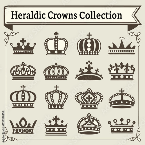 A collection of vintage royal crown vector icons, perfect for heraldic design elements or luxurious king and queen logos