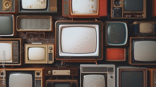 A collection of vintage televisions stacked on top of each other, with their screens cracked and dusty