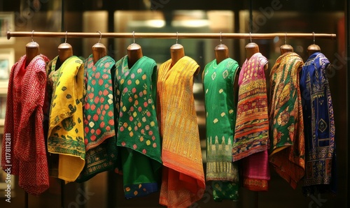 A collection of vividly colored traditional and contemporary clothing items showcased on a display stand in a store.