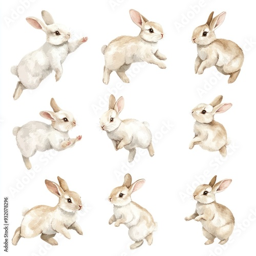 A collection of watercolor illustrations of playful rabbits in various poses.