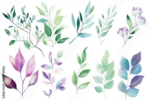 A collection of watercolor leaves arranged on a white background, perfect for use in designs and illustrations