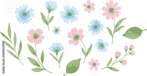 A collection of watercolor-style floral elements including blue and pink flowers, green leaves, and budding branches, arranged on a white background.