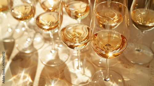 A collection of wine glasses filled with a golden-hued white wine, perfect for creating a sophisticated and elegant atmosphere.