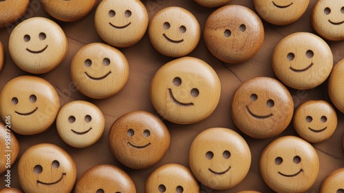A collection of wooden smile face buttons, showcasing happiness and positivity in a charming, artistic arrangement.