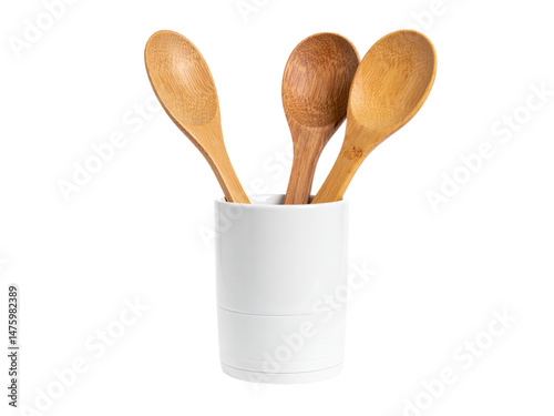 A collection of wooden spoons nestled in clean white cup, rustic kitchen utensil aesthetic