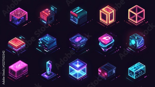 A collection of Y2K-inspired retro-futuristic sticker designs, featuring playful voxel art elements and neon pixel aesthetics