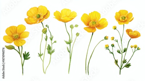 A collection of yellow flowers with varying stages of bloom, showcasing delicate petals and green stems