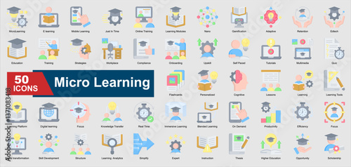 A collection set of Micro Learning flat icons featuring e learning, mobile learning, tutorials, education, gamification, digital training, workplace upskilling, and more. Perfect for illustration