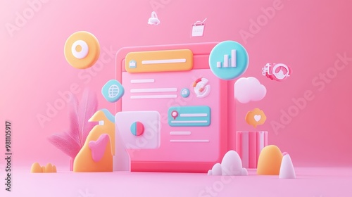 A colorful 3D illustration of a digital interface with various icons and shapes.