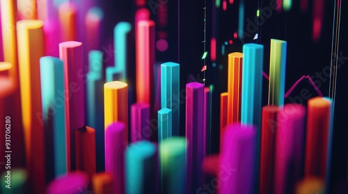 A colorful 3D rendering of digital financial symbols and marketing charts converging into a growing bar chart