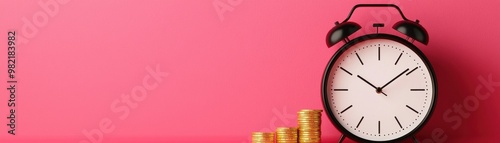 A colorful alarm clock beside stacked coins, symbolizing the concept of time value in finance and investment.