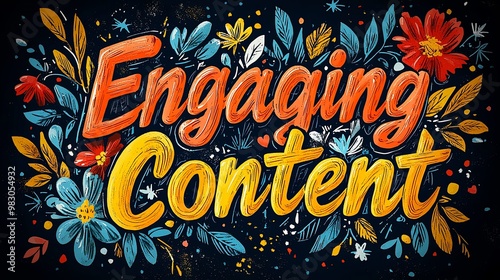 A colorful and dynamic floral-themed artwork featuring the phrase 'Engaging Content' in bold and vibrant colors, surrounded by an array of flowers and foliage.