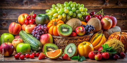 A Colorful Arrangement of Fruits in a Basket on a Wooden Table, fruit, still life