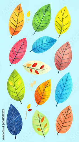 A colorful arrangement of various leaves on a light blue background.