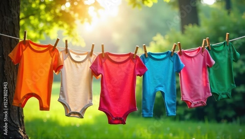 A colorful array of clothing items pegged to a rustic wooden clothesline, drying gently in the sun Perfect for laundry, spring, summer, and outdoor themes , simple, linen, hanging clothes