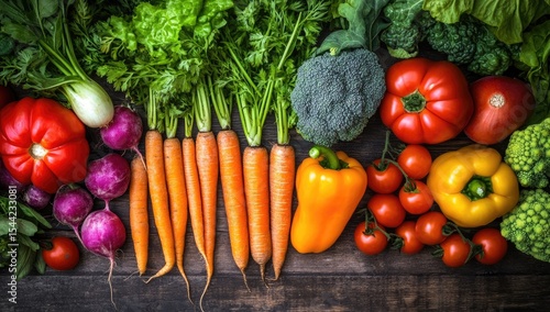 A colorful array of fresh vegetables, including carrots and tomatoes, arranged on an old wooden table.