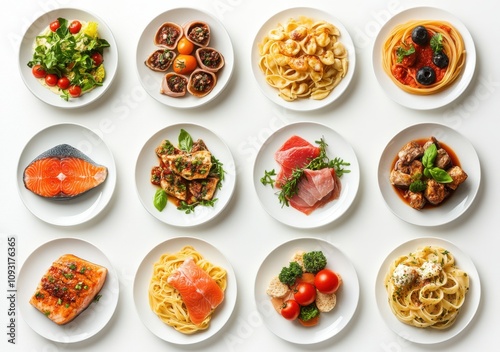 A Colorful Array of Gourmet Dishes Featuring Fresh Ingredients, Delicious Pasta, Grilled Meats, Seafood, and Savory Salads for Culinary Inspiration