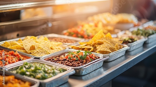 A colorful array of nachos, beans, and fresh toppings displayed in trays, perfect for a vibrant taco or nacho bar setup.