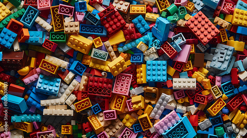 a colorful array of scattered bricks. Here are the details: The image showcases a large number of bricks in various vibrant colors