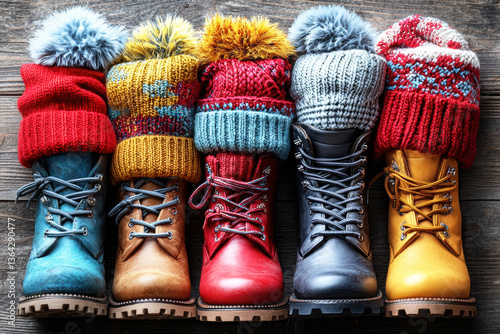A colorful array of stylish winter boots with knitted cuffs, showcasing vibrant patterns and textures against a rustic wooden background.