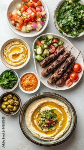 A colorful array of traditional Arabic dishes including grilled kebabs, hummus, fresh salads, and various dips arranged beautifully