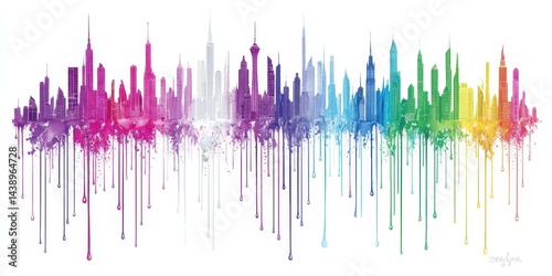 A colorful, artistic city skyline with vibrant paint drips blending into a white background.