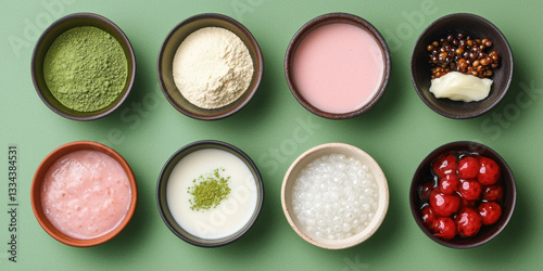 A colorful assortment of bowls containing various powders and ingredients, arranged neatly on a green background, showcasing culinary diversity.