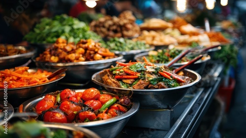 A colorful assortment of delicious and vibrant food dishes displayed in a bustling street market, highlighting the richness of culinary diversity and flavors available.