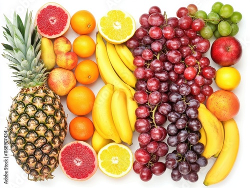 A Colorful Assortment of Fresh Fruits Including Pineapple, Grapes, Bananas, Citrus, and More Arranged Artistically on a White Background for Health and Nutrition Themes