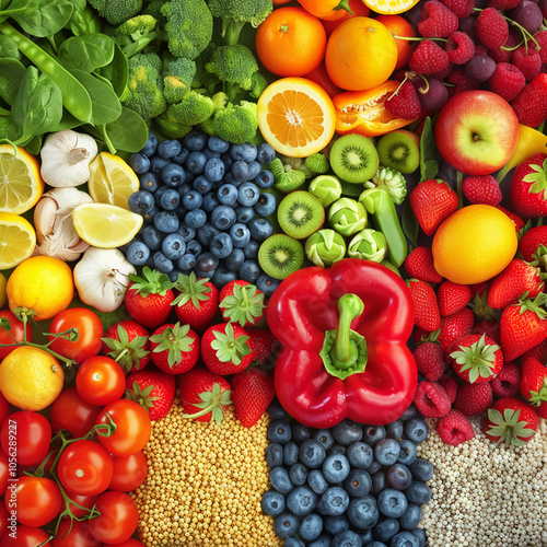 A colorful assortment of fruits and vegetables, including broccoli, blueberries, oranges, kiwi, strawberries, and red peppers, is displayed in a close-up shot