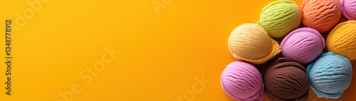 A colorful assortment of ice cream scoops arranged on an orange background, showcasing various flavors and vibrant hues.