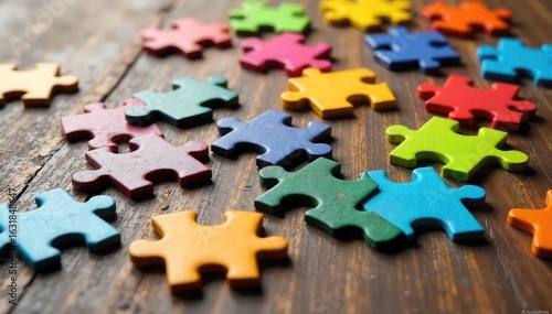 A colorful assortment of jigsaw puzzle pieces scattered on a wooden surface, some connected, others separate, suggesting the challenge and satisfaction of completing a puzzle , abstract, wood