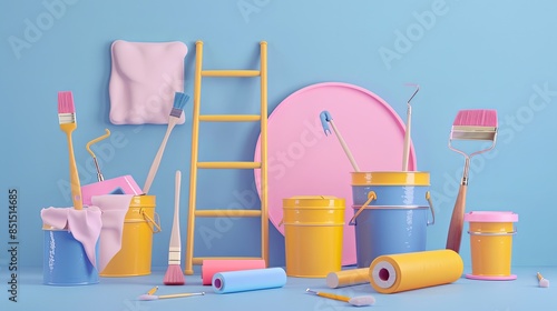 A colorful assortment of professional painting tools and supplies, including rollers, brushes, buckets of paint, and a folding ladder, arranged on a light blue background. Generative AI