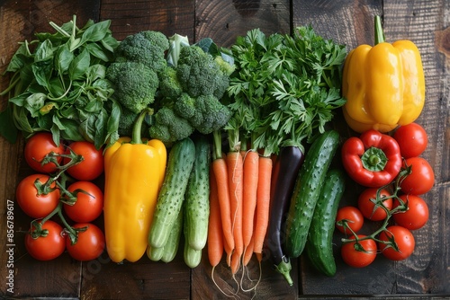 A colorful assortment of vegetables laid out on a rustic wooden table, including bell peppers, tomatoes, cucumbers, carrots, and broccoli.