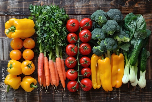 A colorful assortment of vegetables laid out on a rustic wooden table, including bell peppers, tomatoes, cucumbers, carrots, and broccoli.