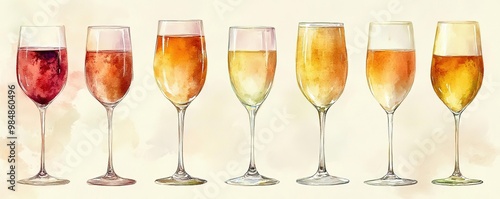 A colorful assortment of wine glasses filled with different beverages, perfect for celebrations and gatherings.