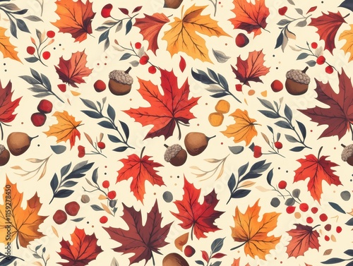 A colorful autumn-themed pattern featuring leaves, acorns, and berries.