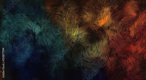 A colorful background with multiple biometric patterns, including fingerprints and facial engravings, on a black background.