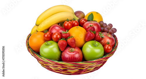 A colorful basket overflowing with a variety of fresh fruits isolated on transparent background