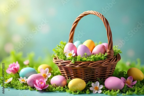 A colorful basket overflowing with pastel Easter eggs, nestled amongst spring flowers and greenery , sweets, hyacinths