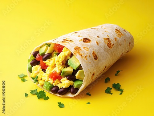 A colorful burrito filled with scrambled eggs, black beans, and fresh vegetables.
