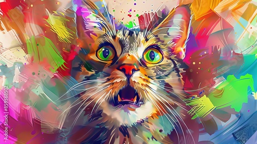 A colorful cat with a green eye is staring at the camera. The cat's mouth is open, and its tongue is sticking out. The image has a playful and whimsical mood, with the bright colors
