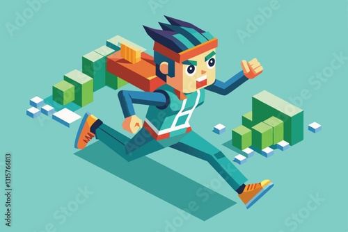A colorful character is energetically running across a playful block environment filled with vivid elements, Running wild Customizable Isometric Illustration