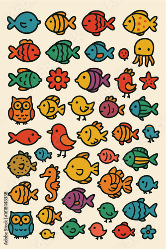 A colorful collection of cartoon fish, birds, and sea creatures in retro style