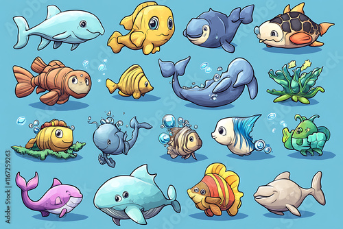 A colorful collection of cute, cartoonish sea creatures and plants in an underwater scene.
