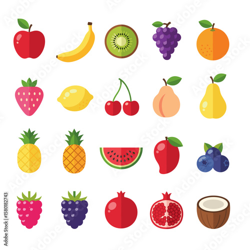 A colorful collection of flat vector fruit icons including apple, banana, kiwi, grapes, orange, strawberry, lemon, cherries, pears, pineapple, watermelon, ma...