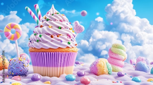 A colorful cupcake topped with swirls of frosting, surrounded by candies and playful clouds, creating a whimsical dessert scene.